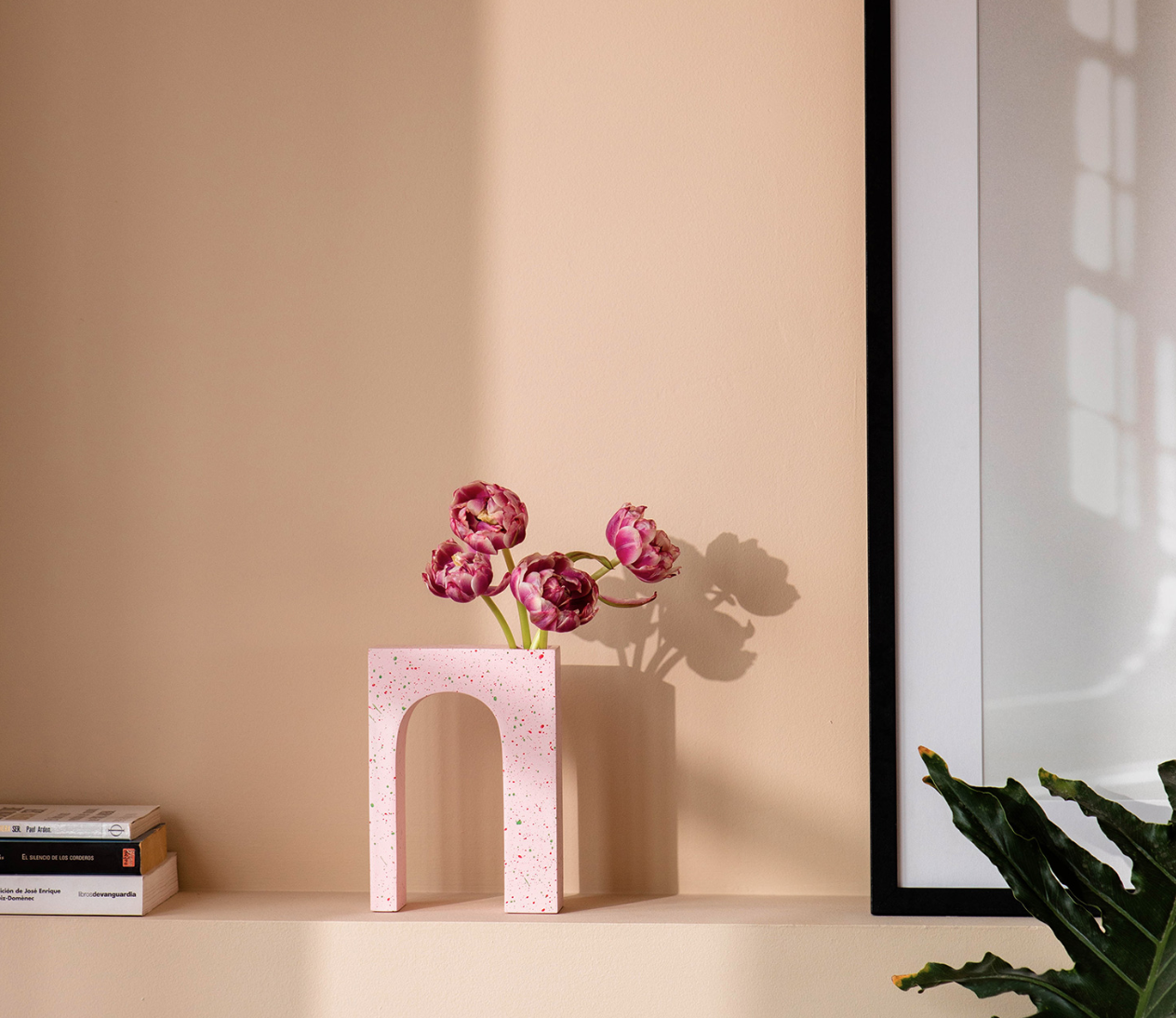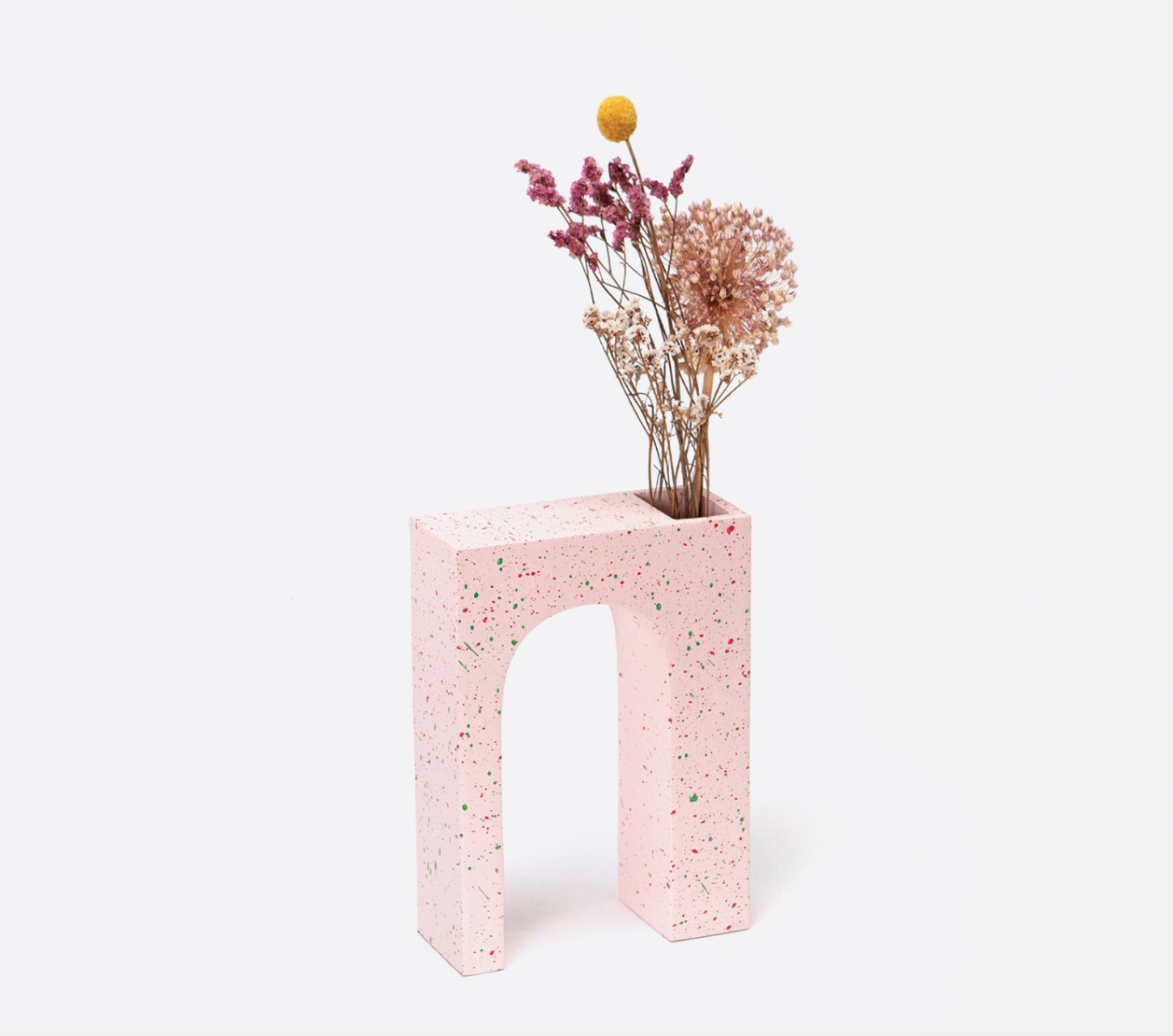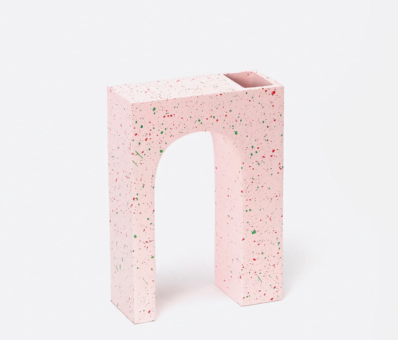 • Vaso decorativo rosa claro em formato de arco com manchas coloridas e abertura para flores