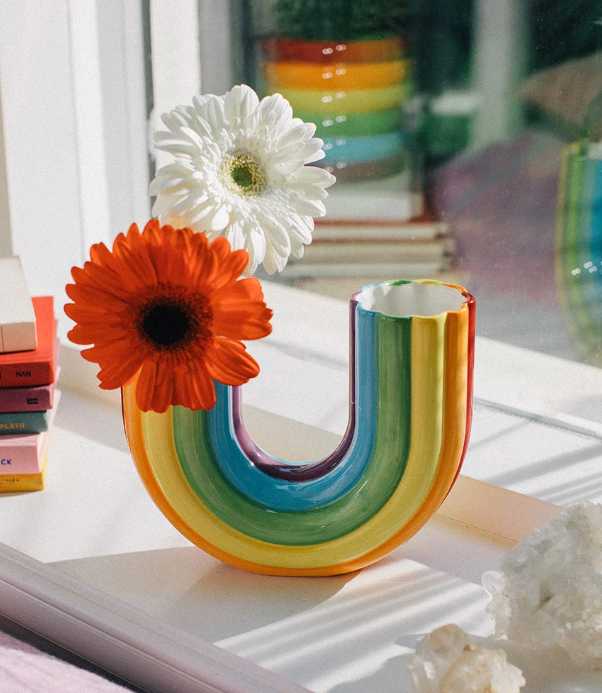 Este vibrante vaso de arco-iris com espaço duplo para as suas flores dará uma sensação de alegria à sua casa.