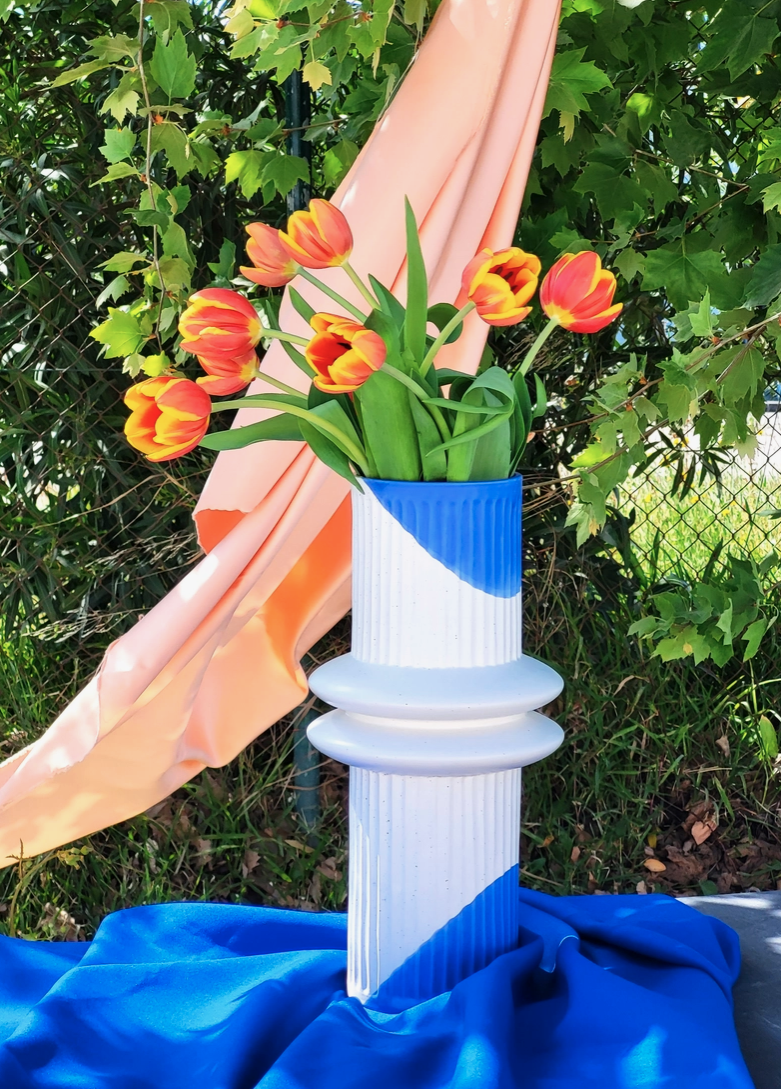 Vaso Tália Tall pintado à mão, em faiança, com relevo e um toque de cor (azul, preto e terracota). Inspirado na coluna grega, traz-nos a perfeição imperfeita da arquitetura clássica. A sua forma primordial adapta-se perfeitamente a diferentes ambientes e estilos. Um pedaço de história para a sua casa! Todas as peças “Pó de Barro” são únicas. Devido à produção artesanal todos os produtos apresentam variações de formas, cores e acabamentos.