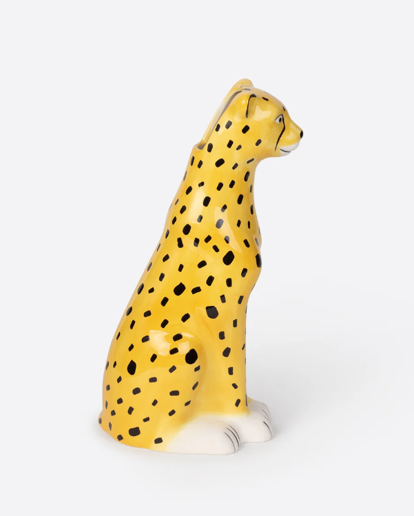 • Escultura decorativa de guepardo amarelo com manchas pretas sentada.