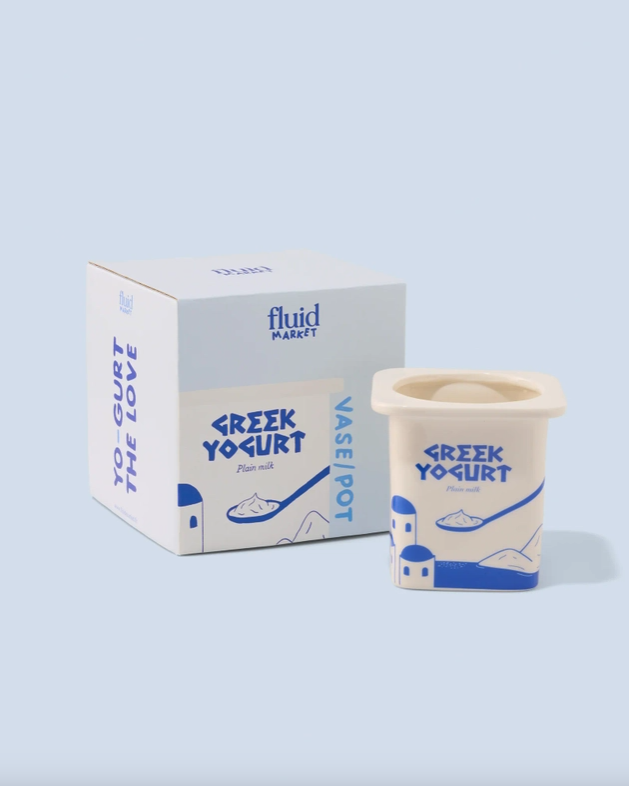 • Vaso cerâmico branco e azul e embalagem com texto sobre iogurte grego.