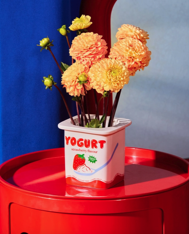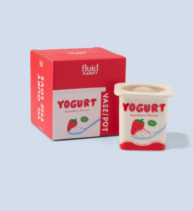 • Vaso em forma de iogurte de morango com caixa vermelha e branca