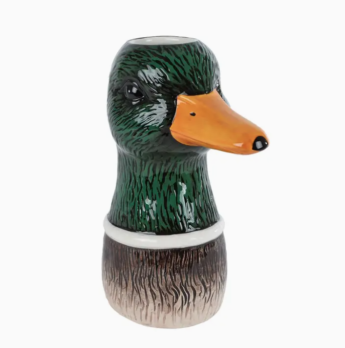 • Vaso decorativo em cerâmica formato cabeça de pato com cores verde, laranja e castanho