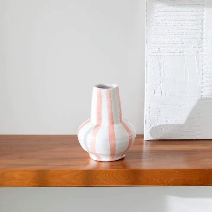 • Vaso de cerâmica riscado em branco, rosa e verde sobre mesa de madeira