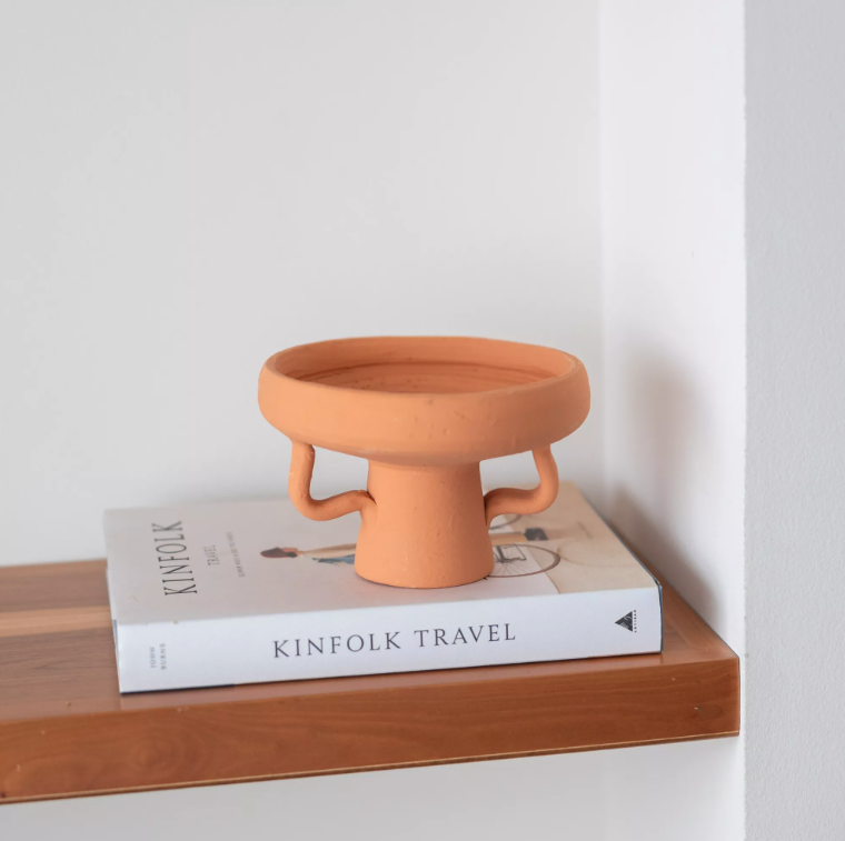 • Prato decorativo de terracota sobre livros na prateleira