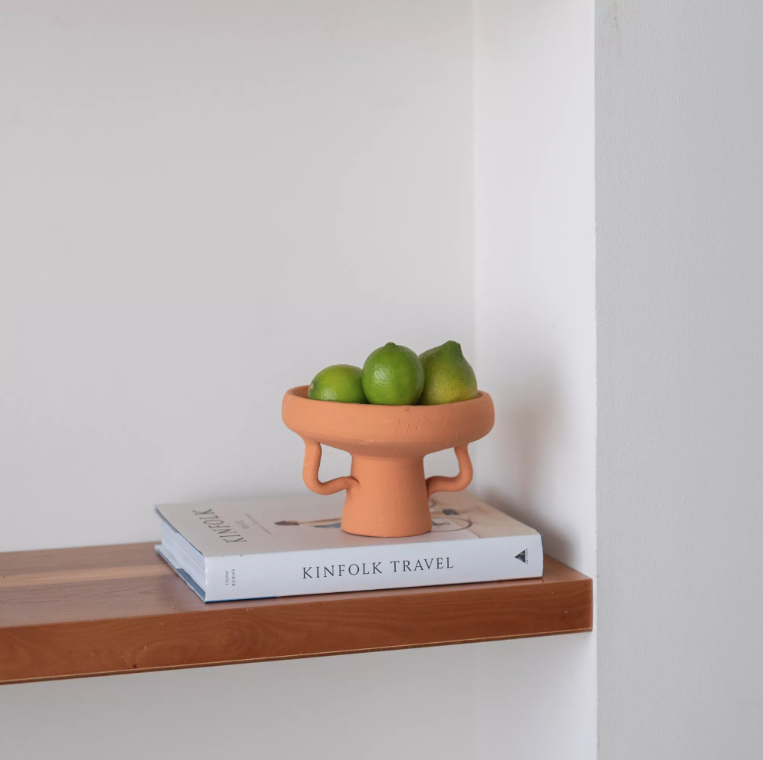 • Fruteira de terracota com limas verdes sobre livro KINFOLK TRAVEL numa prateleira de madeira