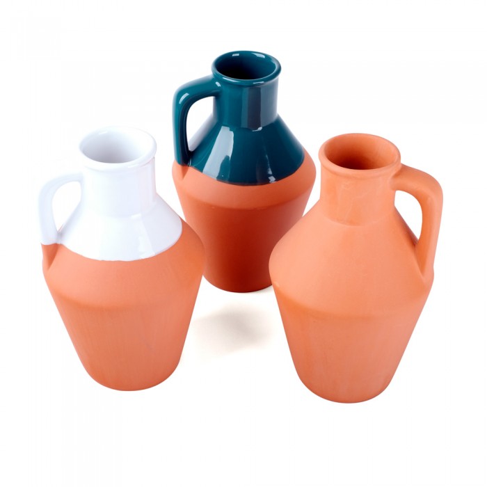 Base faiança esmaltada. Vaso em terracota com um design contemporâneo inspirado nas formas de empregadas de leite ao longo da vida. À prova de água no interior, pode colocar as suas flores secas ou com água, e colocá-las em qualquer superfície.