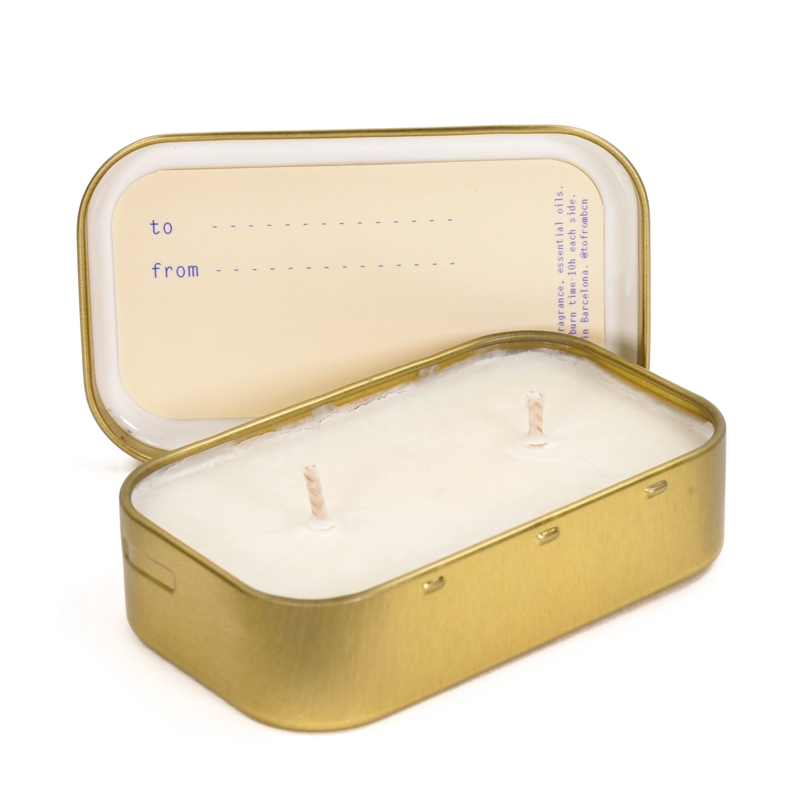 • Vela branca em caixa metálica dourada com tampa e texto TO e FROM