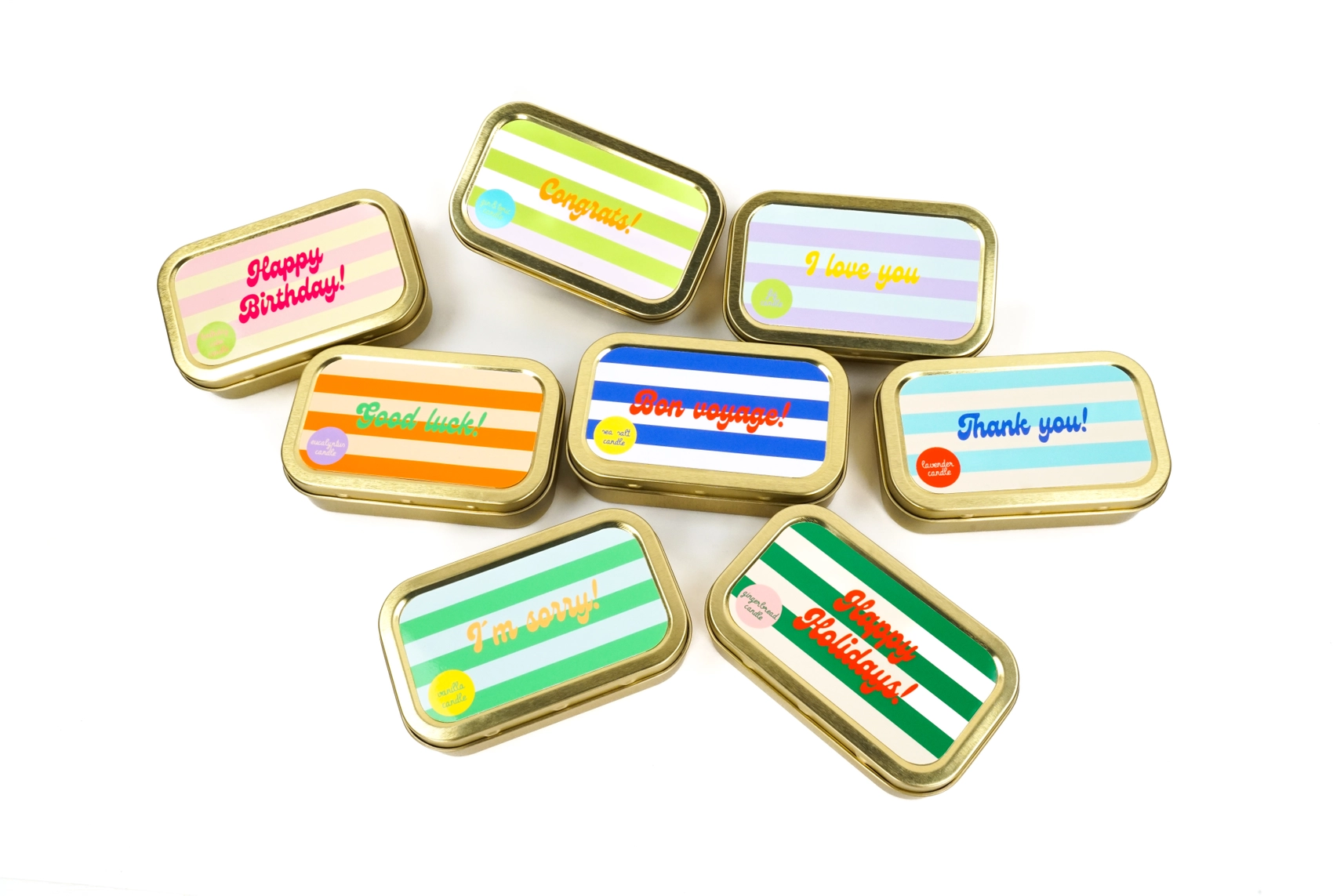 • Oito latas pequenas retangulares com tampas coloridas e mensagens em inglês