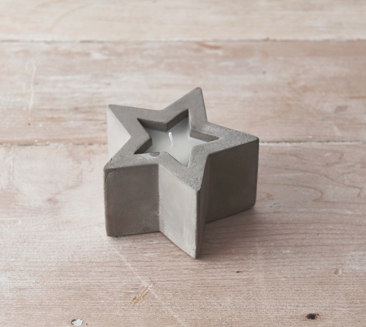 • Vela branca em suporte de concreto cinza formato estrela sobre superfície de madeira clara