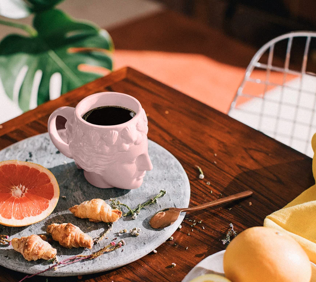 • Caneca rosa em forma de cabeça com café sobre placa cinzenta, croissants, toranja e mesa de madeira