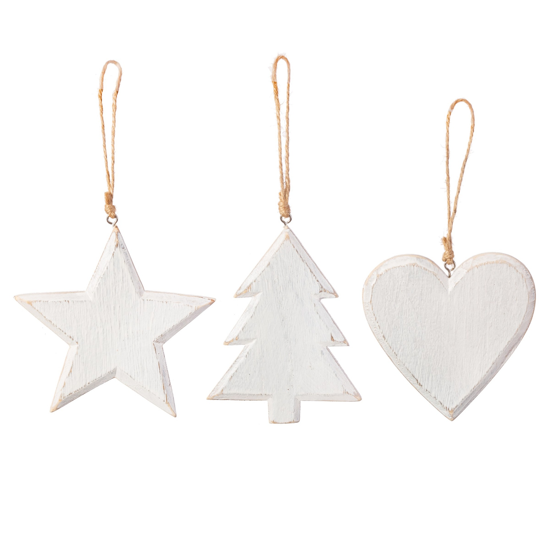 • Ornamentos de madeira brancos em forma de estrela, árvore de Natal e coração com corda para pendurar.