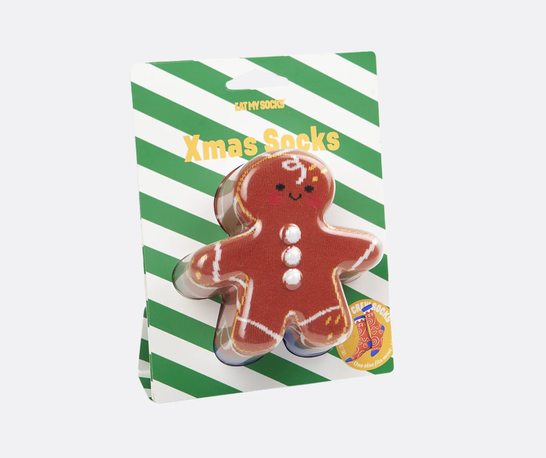 • Embalagem verde e branca com meias de Natal em forma de boneco de gengibre