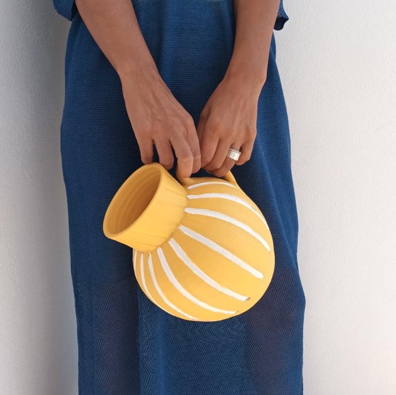 • Pessoa segura vaso amarelo de cerâmica com padrão branco, vestindo roupa azul