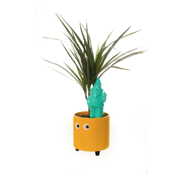 • Vaso amarelo com planta verde e figura de gnomo turquesa