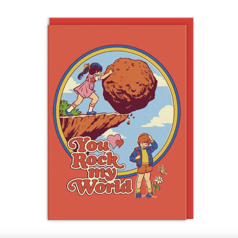 • Cartão vermelho com ilustração de menina e menino e texto You Rock my World