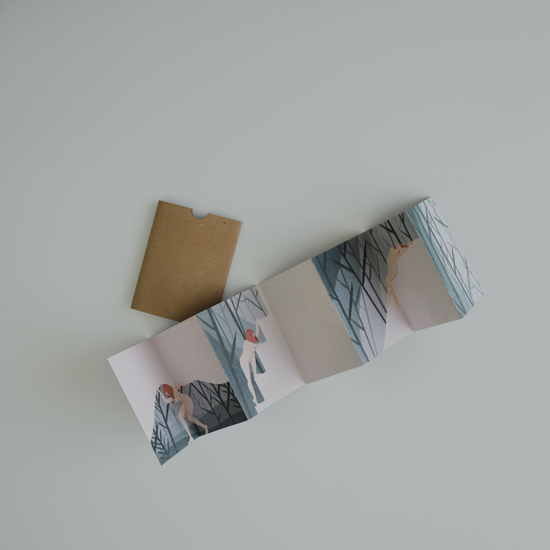 • Folheto ilustrado dobrado ao lado de envelope castanho sobre fundo branco