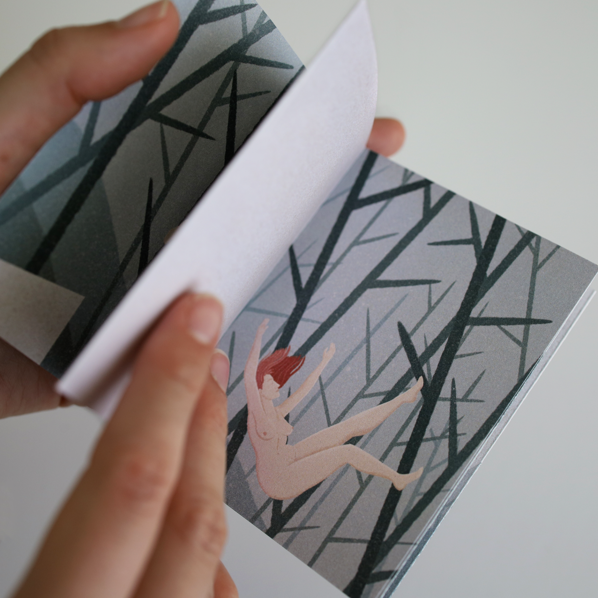 • Livro pequeno com capa ilustrada mostrando figura feminina nua entre galhos pretos